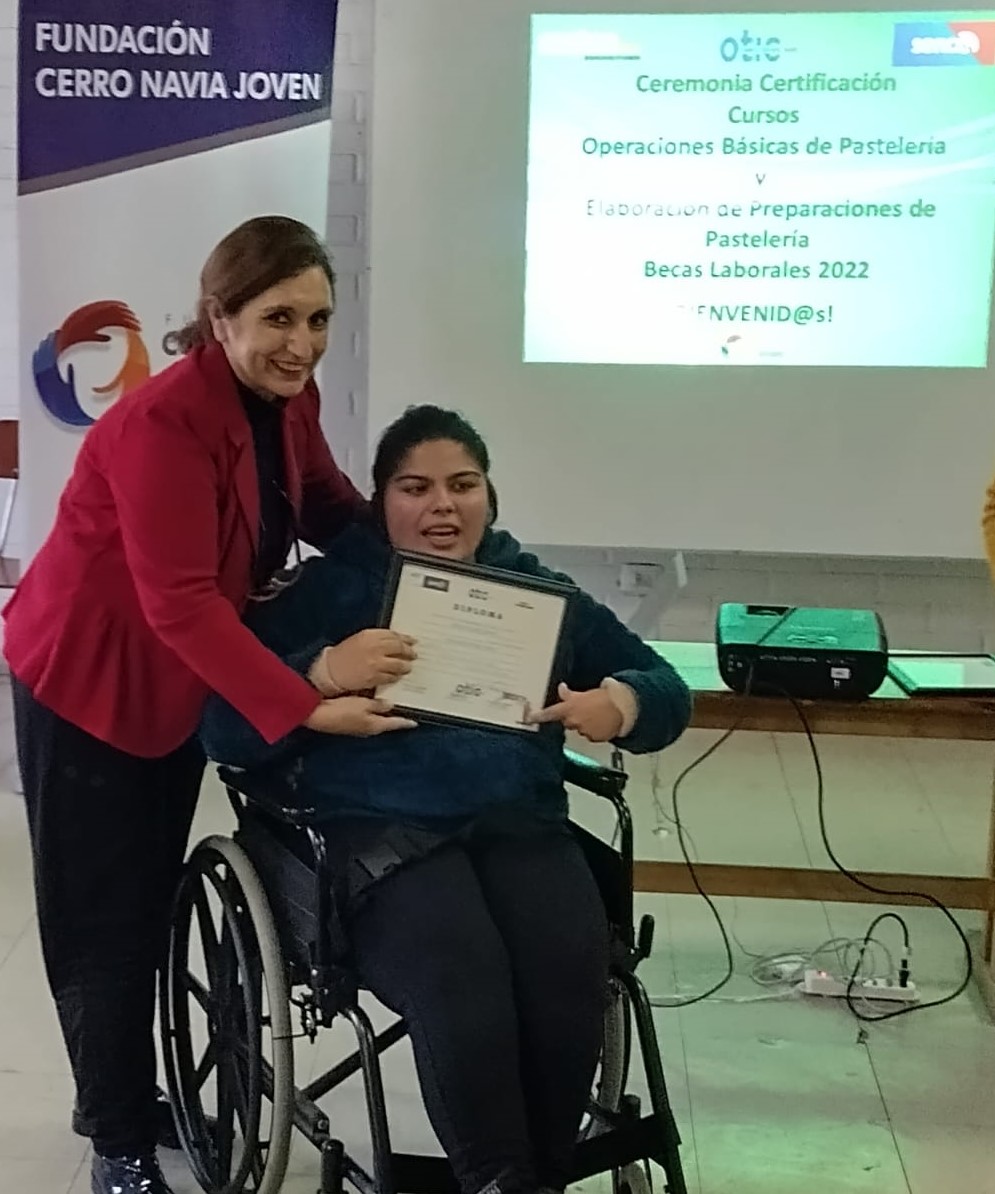 La segunda ceremonia se desarrolló en la comuna de Pudahuel, donde se certificaron 15 personas en situación de discapacidad y cuidadoras, derivadas de Fundación Cerro Navia Joven, egresadas y egresados del curso de “Elaboración de Preparaciones de Pastelería”, de 115 horas cronológicas, curso ejecutado por el OTEC Reinoso y Vivanco Ltda. y financiado con recursos de excedentes de capacitación mandatados por la empresa Dimerco Comercial S.A.