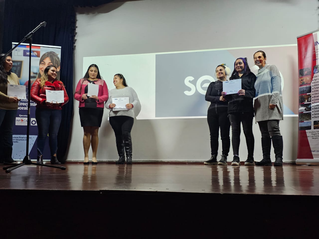 La primera ceremonia fue en la comuna de La Pintana, donde se certificaron un total de 20 mujeres emprendedoras derivadas de la Corporación United Way, el primer grupo de egresadas correspondió al curso de “Servicios de Masajes Estéticos”, de 150 horas cronológicas y el segundo grupo al curso de “Peluquería”, de 160 horas cronológicas, curso ejecutado por el OTEC INFOCAL Ltda. y financiado con recursos de excedentes de capacitación mandatados por la empresa Procter and Gamble.
